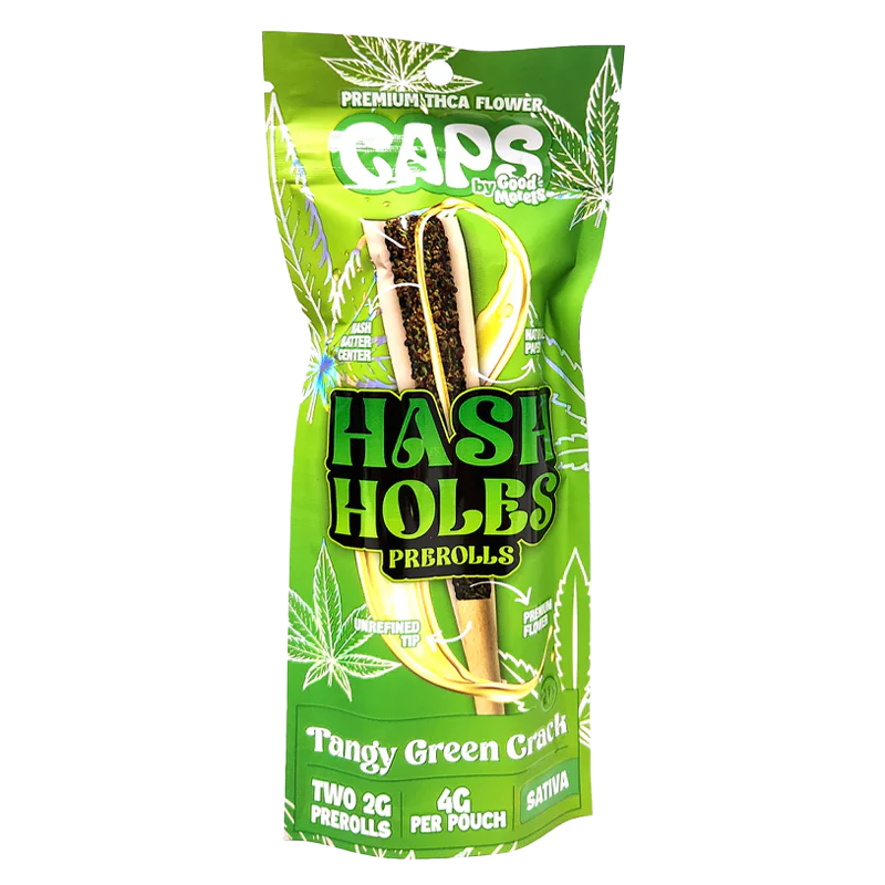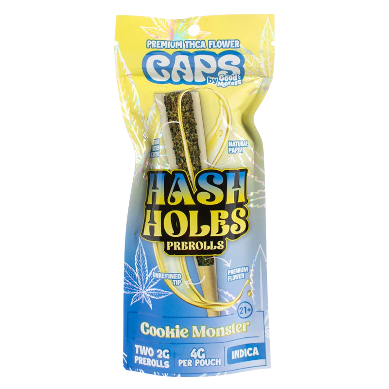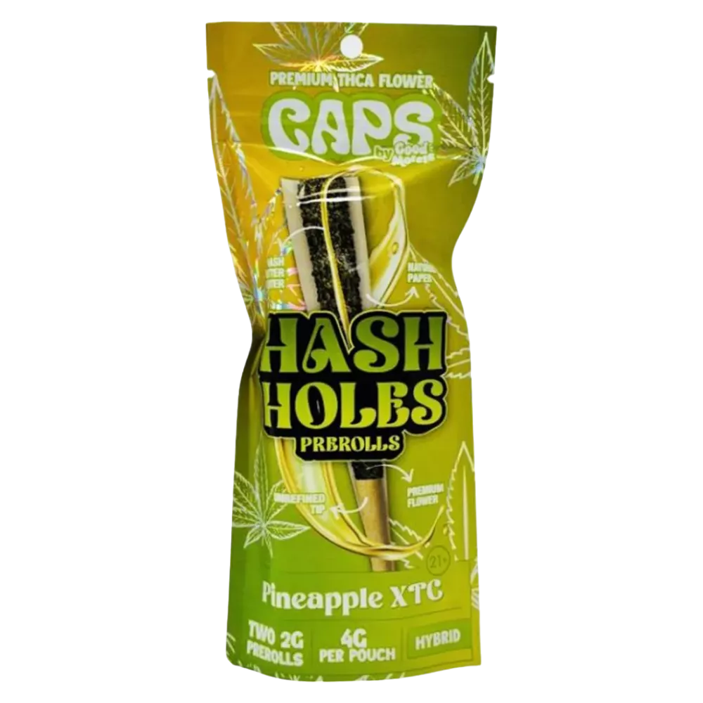 Indulge in the premium experience of CAPS HASH HOLES THC-A prerolls. Each pack contains two prerolls, each weighing 2 grams, ensuring a potent and seamless smoking session.
