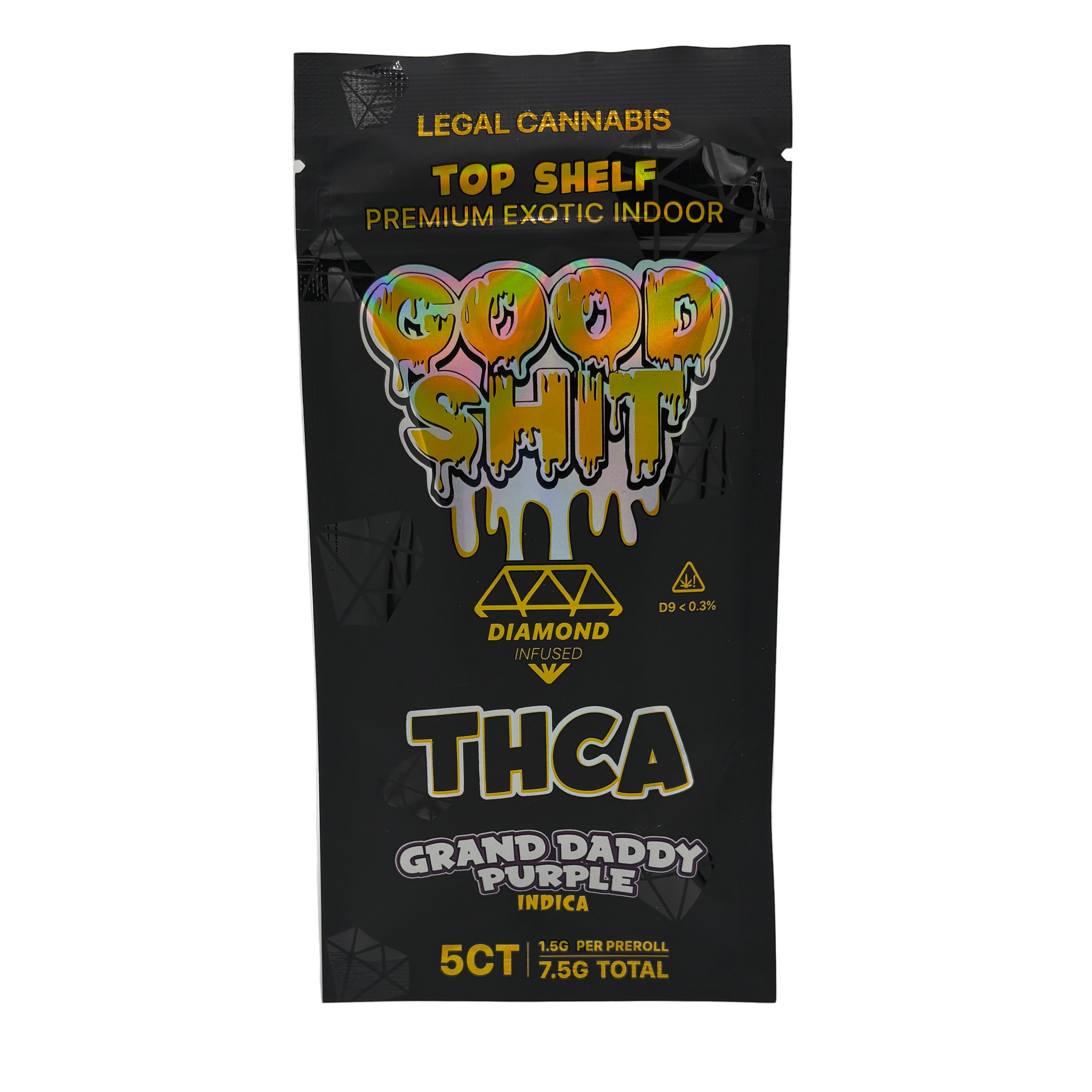 Experience the ultimate bliss with our Good Shit THCA Diamond Infused Pre Rolls pack. Each pack contains 5 pre-rolls, each weighing 1.5g, totaling 7.5g of premium cannabis goodness.