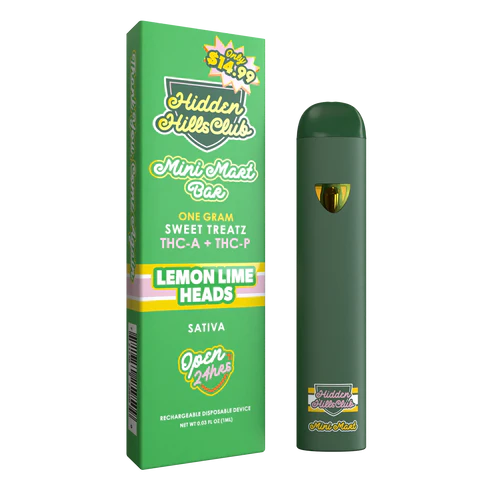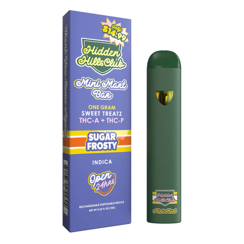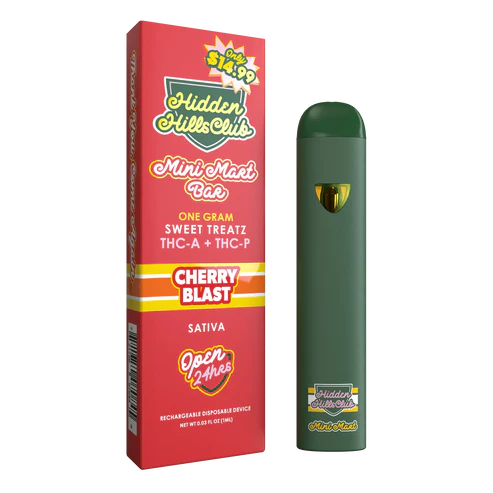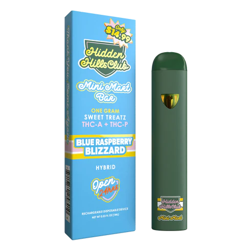 Elevate your vaping experience with the HIDDEN HILLS MINI MART BAR THC-A + THC-P 1 GRAM DISPOSABLE. This premium selection offers a range of delightful variants, including Blue Cotton Candy (Indica), Blue Raspberry Blizzard (Hybrid), Cherry Blast (Sativa), Grape Lolliz (Indica), Lemon Lime Heads (Sativa), Mango Burst (Sativa), Pink Bubble Blitz (Hybrid), and Sugar Frosty (Indica).