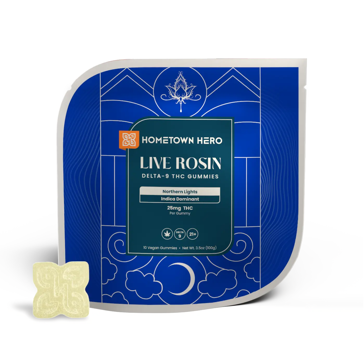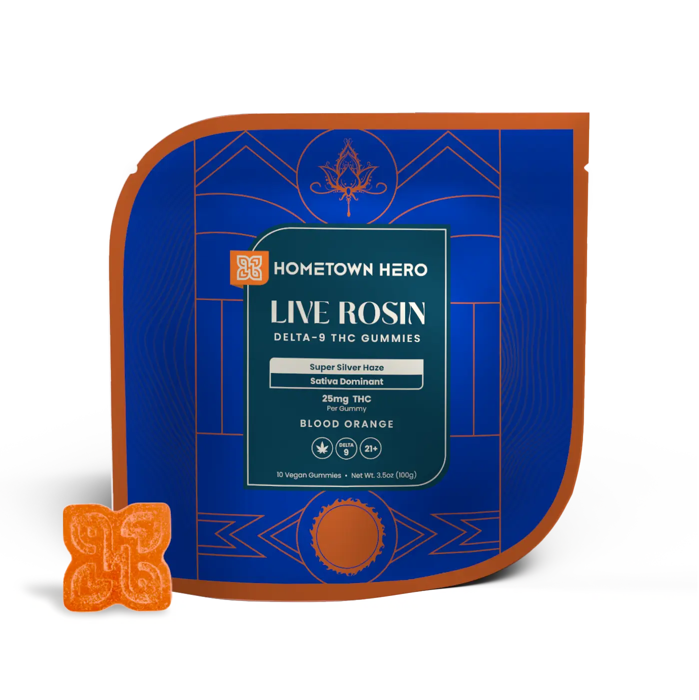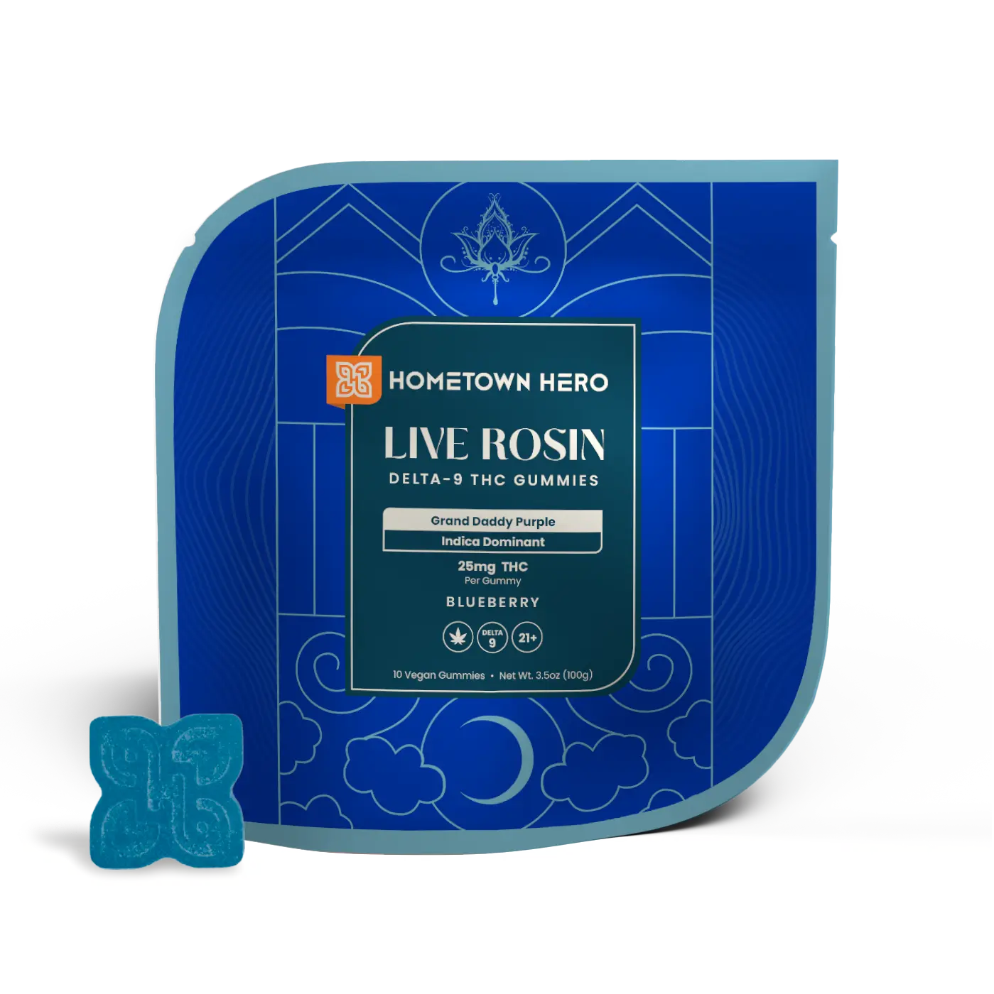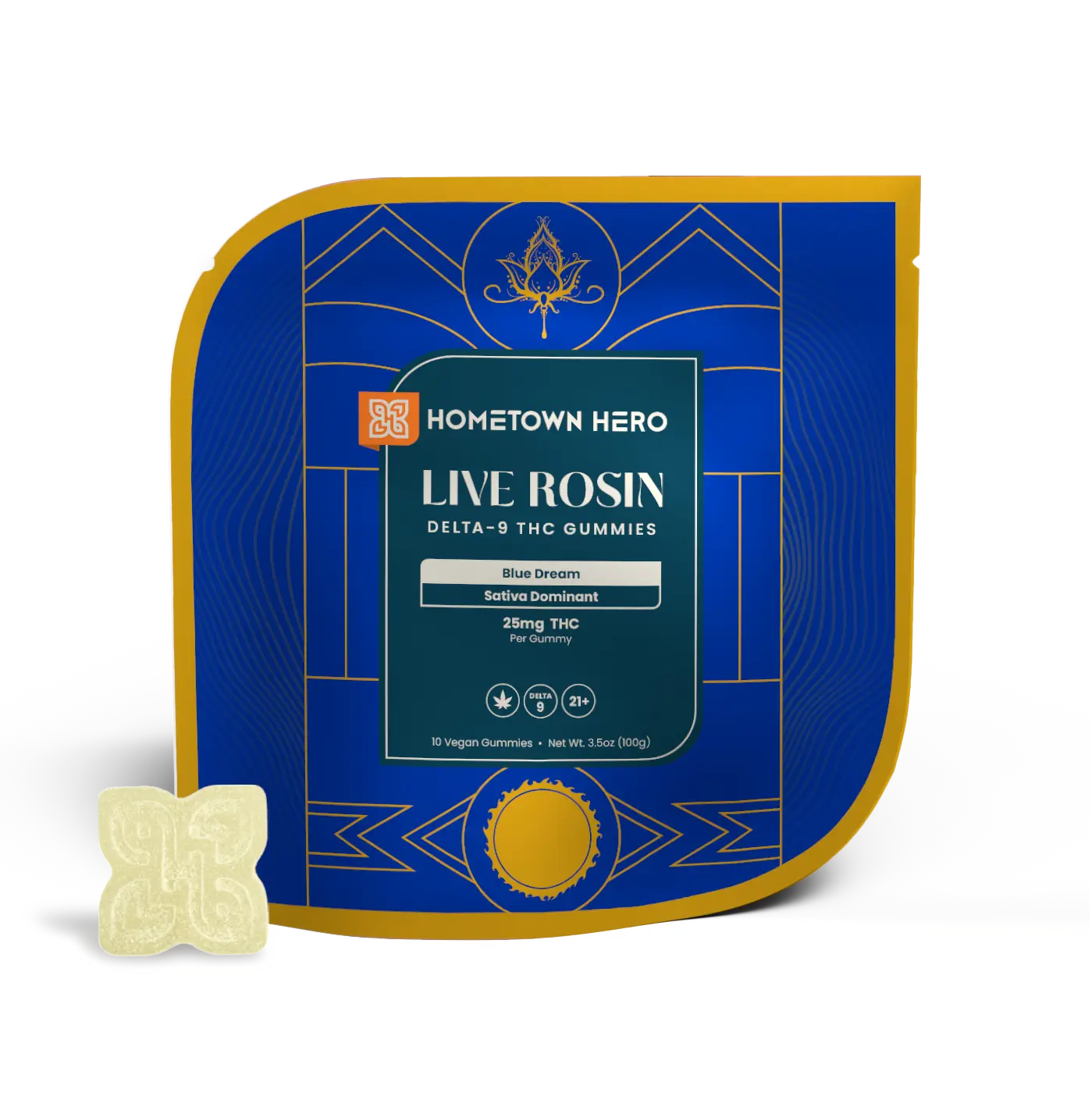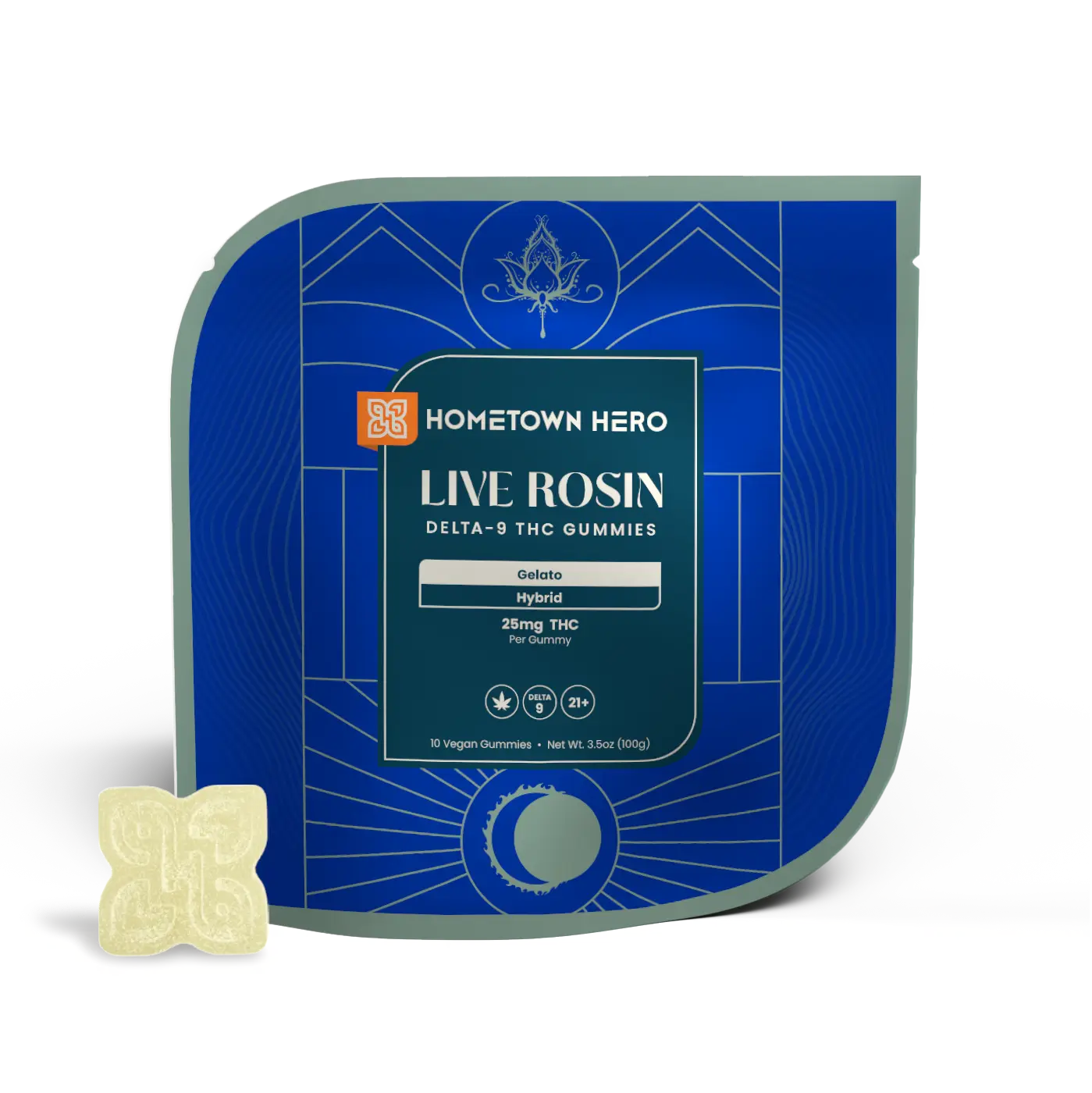 Grab your pack of HOMETOWN HERO 25MG D9 LIVE ROSIN GUMMIES today and explore the world of cannabis in a flavorful and enjoyable way!