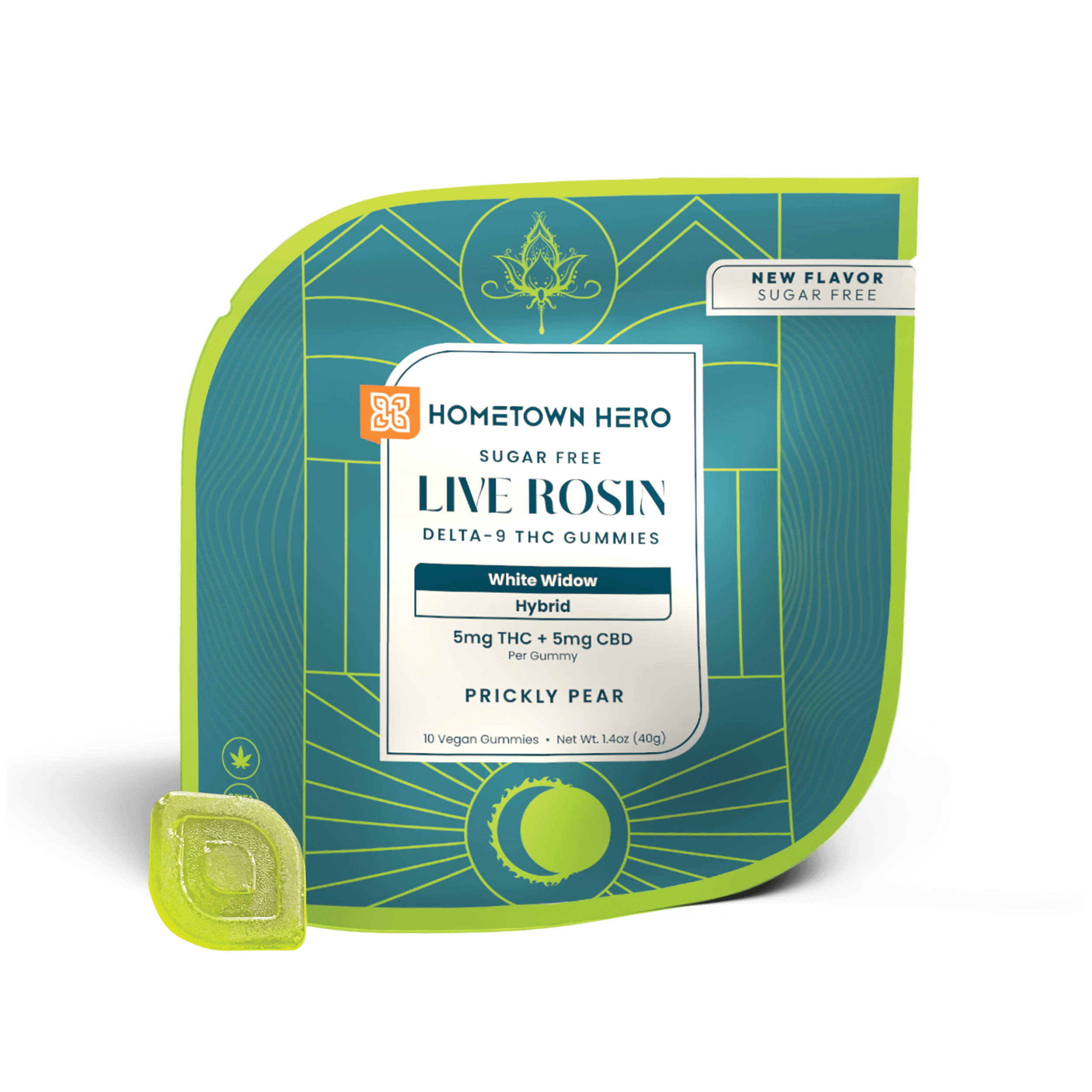Indulge in the ultimate cannabis experience with Hometown Hero's 5mg D9 Live Rosin Gummies. Each pack contains a variety of flavors including Blue Dream (Sativa), Grand Daddy Purple (Indica), Northern Lights (Indica), Super Silver Haze (Sativa), and White Widow (Hybrid). Designed to provide a unique and flavorful journey with every bite.