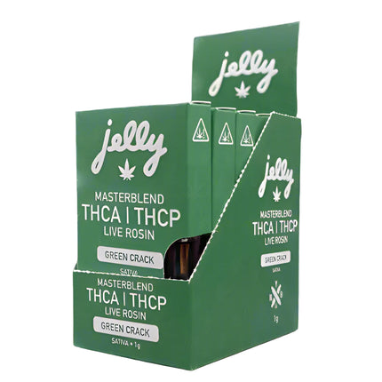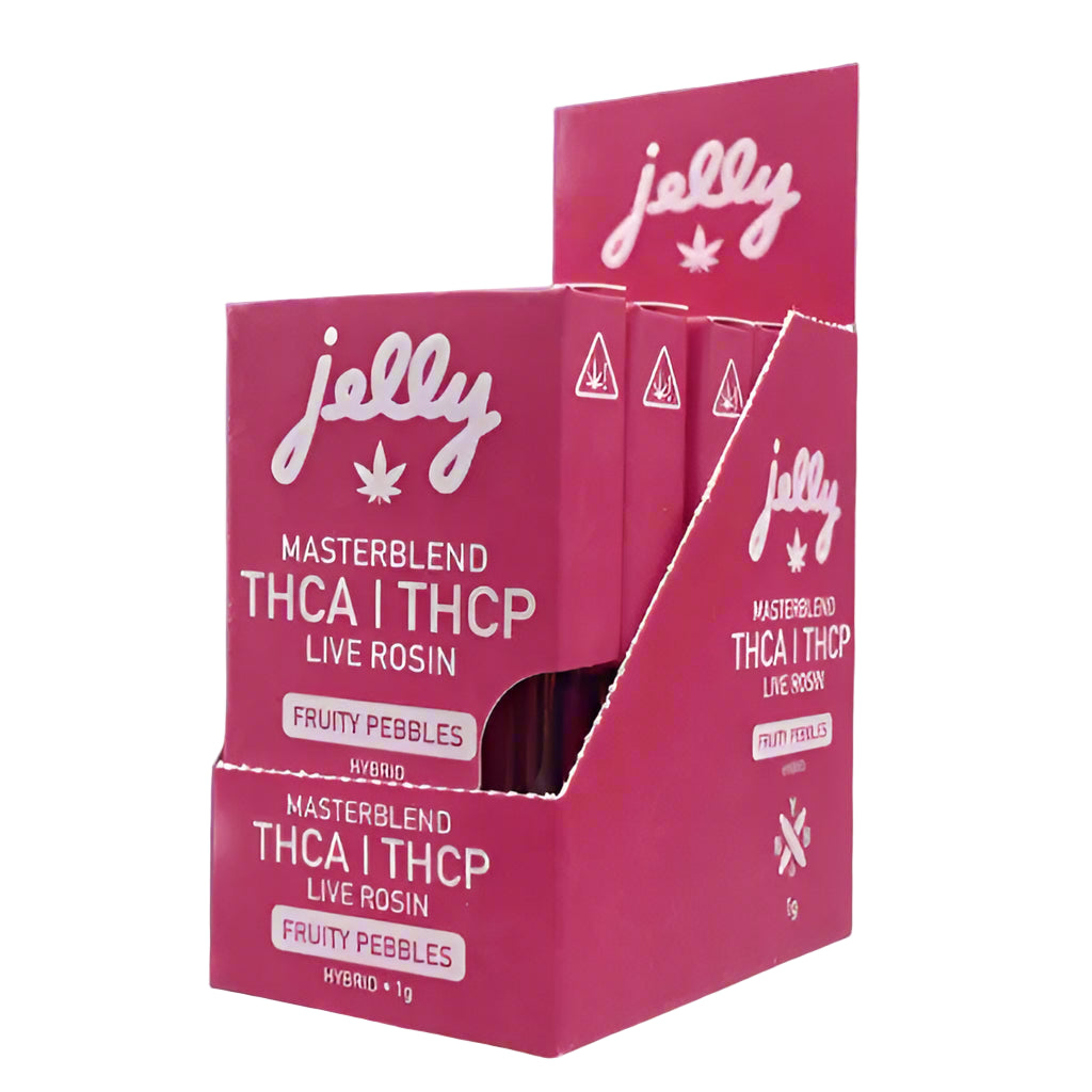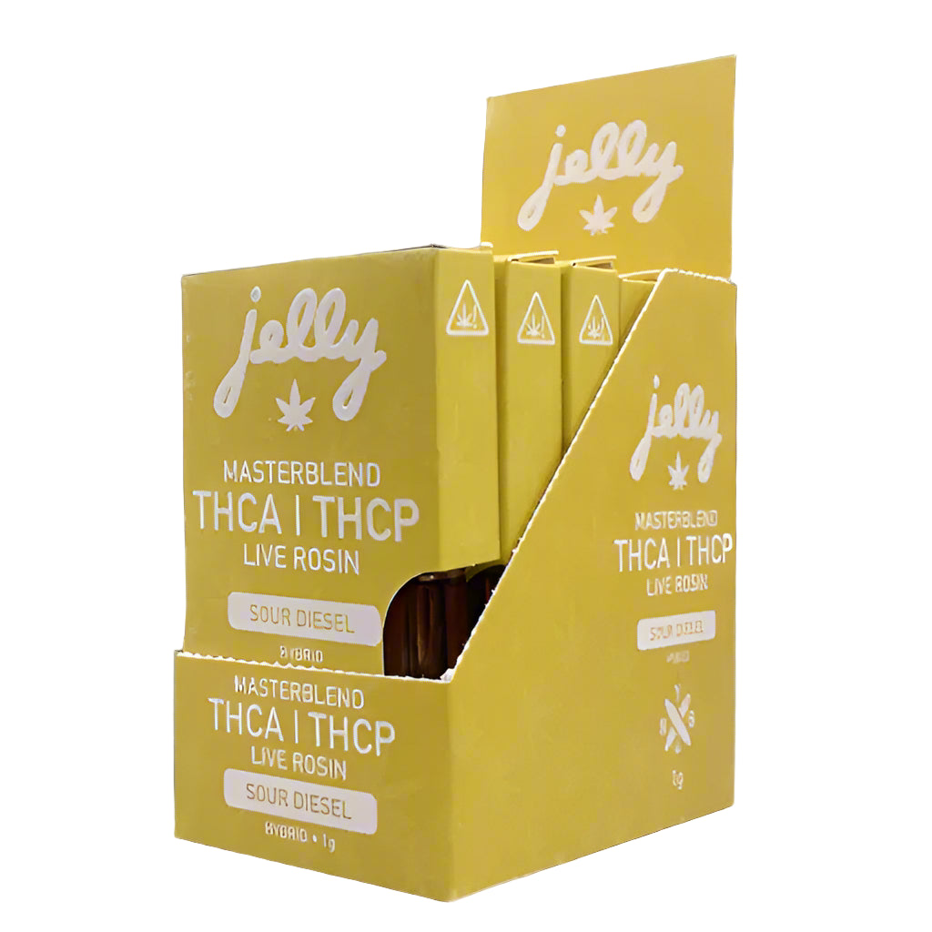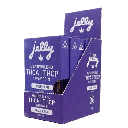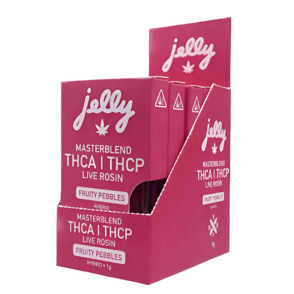 Experience the unique blend of Jelly Masterblend with this Live Rosin 1ml Cartridge, infused with premium quality THCA and THCP for an elevated vaping experience. Each cartridge offers a tantalizing profile featuring strains like Blue Dream, Cherry Gelato, Fruity Pebbles, Green Crack, Sour Diesel, and Space Cake.