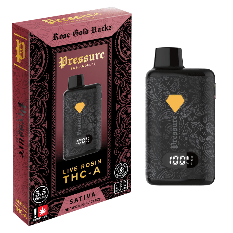 Whether you prefer fruity strains like Jungle Cake or exotic flavors like Space Runtz, the PRESSURE 3.5G Live Rosin THC-A Disposable has a variety of enticing variants to choose from, including Black Cherry Gelato, Blue Razz Haze, Pineapple OG, Rainbow Skunk, Rose Gold Rackz, Sour Bandana, Strawberry Trainwreck, Super Lemon Cookies, and White Bugatti.